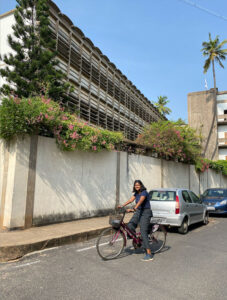 My love for cycling made me take up a cycle tour in the white town. I must say it’s one of the best ways to explore a town. So I enrolled for one at the SITA cultural center. I met my guide Manisha at 7 am . Manisha, an extremely active and knowledgeable lady, began giving me an overview about the city, and it turns out that she knows bengali. So throughout the cycling trip we spoke in Bangla. Manisha would stop by the significant structures and monuments and explain the history behind them. And on my request she was sweet enough to click pictures and videos as well. Interestingly Pondicherry is broadly divided into black town (Tamilian colony ) and white town ( French colony). The city has a blend of traditional Tamilian architecture houses and the French architecture houses. Some houses have a mix of both.